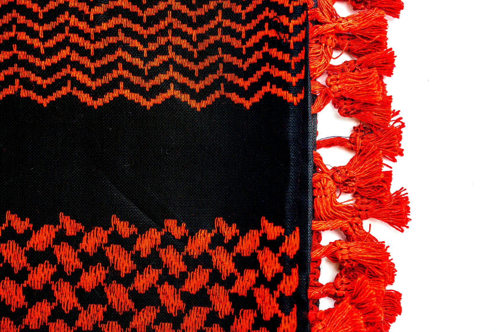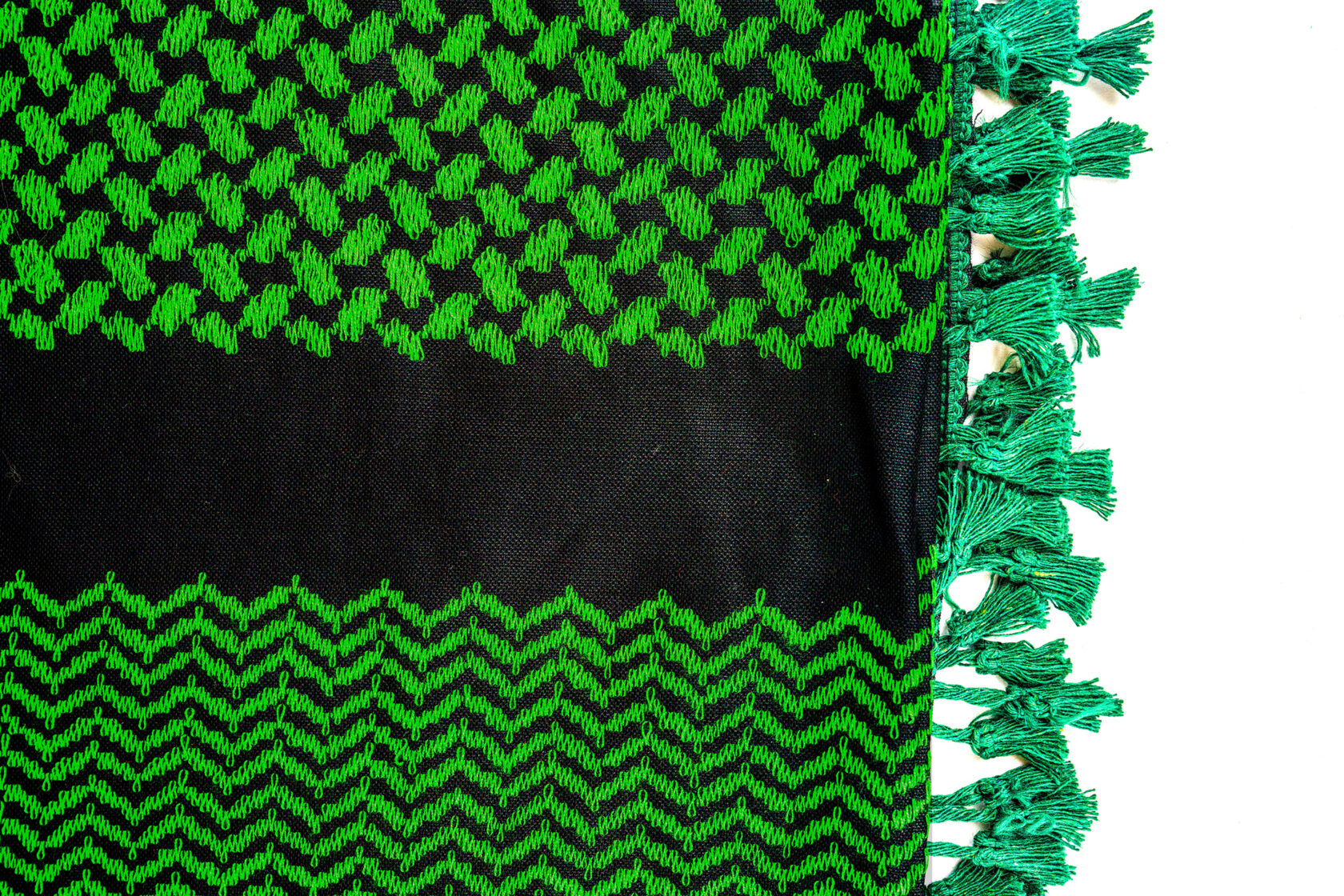 Yasser Hirbawi opened the Hirbawi Textile Factory in 1961 in Hebron, operating 15 machines and producing 150,000 keffiyehs annually by the early 1990s. Today, due to the signing of the 1993 Oslo Accords and the opening of trade with the outside world, only four machines remain in operation producing a mere 10,000 scarves a year. Not one of these scarves are exported, as overseas suppliers produce mass quantities at a fraction of the price, and the shrinking Palestinian economy and Israeli checkpoints and roadblocks create further hindrances to production and trade for small businesses like Mr. Hirbawi’s. In Mr. Hirbawi’s own words: “My machines are in good shape. They can start working tomorrow. I just need a market.” The Keffiyeh’s black and white pattern has come to symbolize the Palestinian struggle; the middle pattern, with its “wire mesh fence” design represents the Israeli occupation, while the oblong-shaped patterns on the side represent olive leaves- a symbol of Palestine and peace.