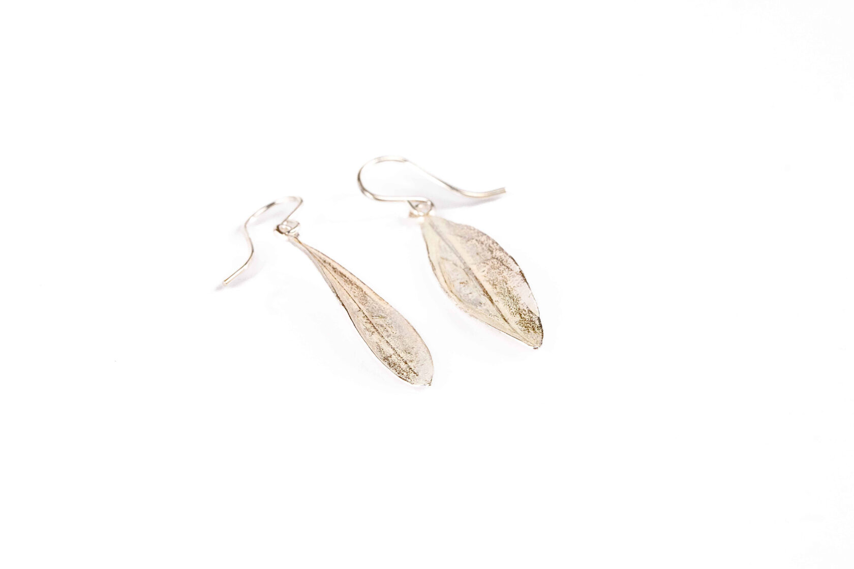 These silver earrings are an exact reproduction of olive tree leaves picked in their maker’s own garden. The production of these unique jewellery pieces starts with making a plaster cast of the leaves and burning them out afterwards. The remaining hole is filled with silver, and the plaster is removed. What is left are exceptional unique silver copies of these precious leaves from the olive tree.