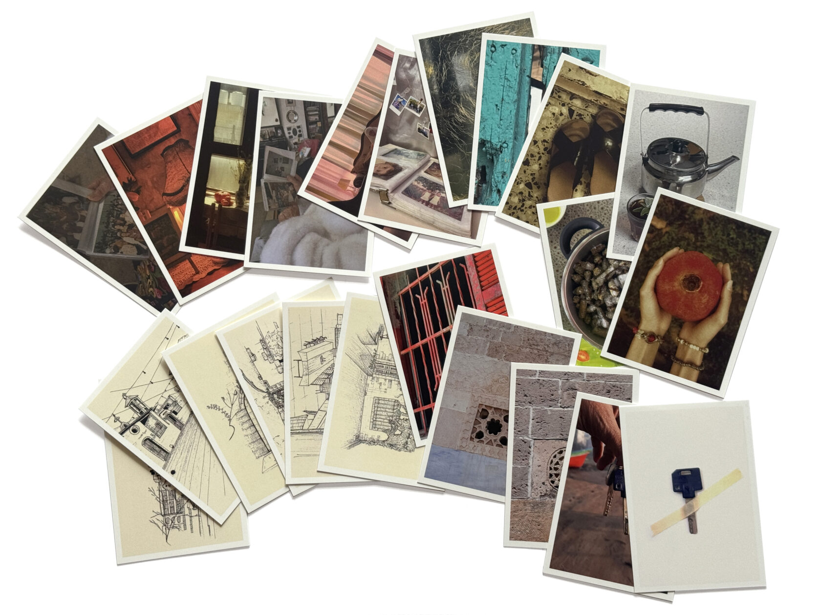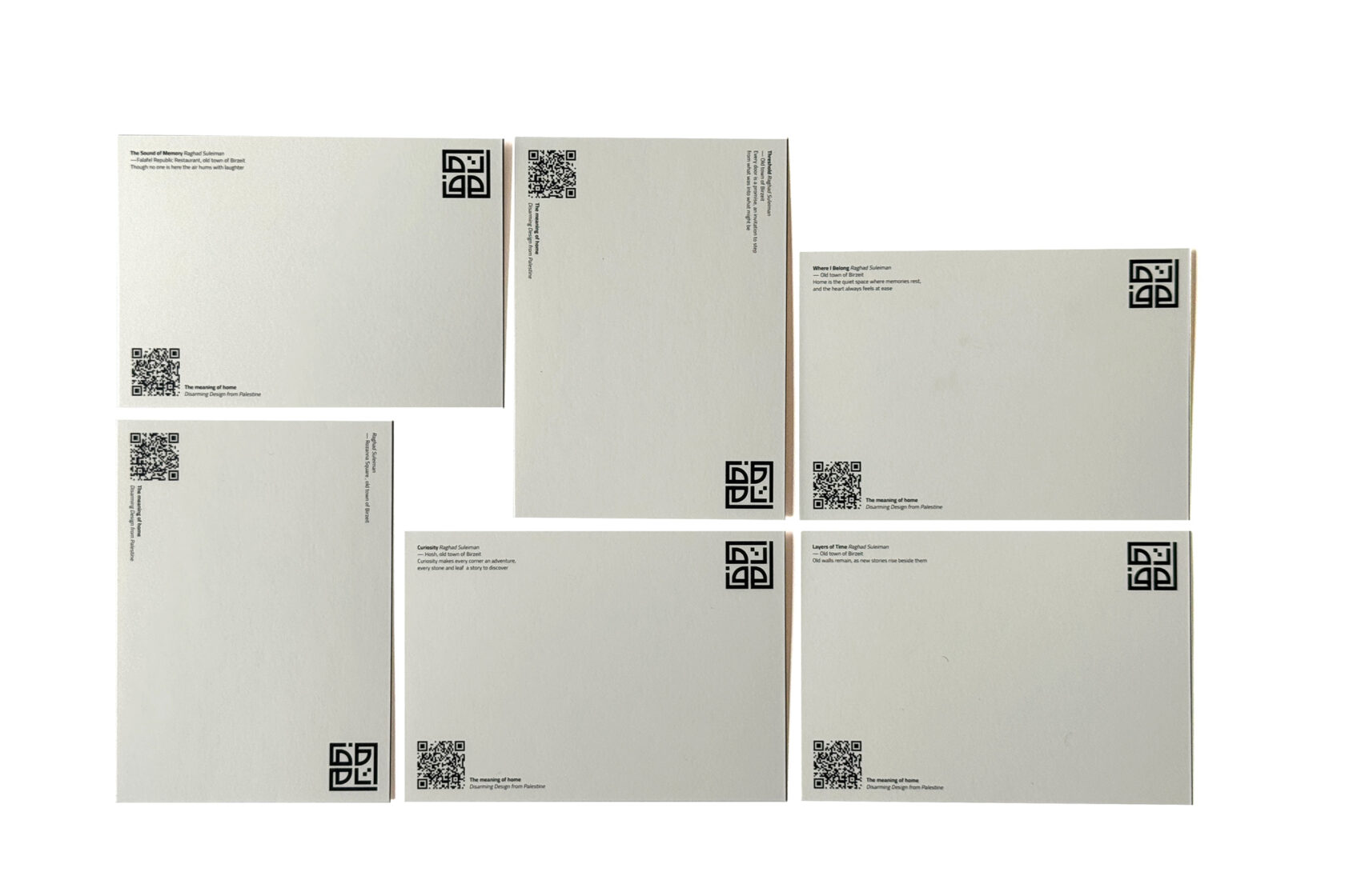 These different sets of postcards offer intimate insights into what home means to designers Aya Alahmad, Ibtisam Abukaff, Jawa Refai, Shahd Faraj, Raghad Suleiman, Malak Zahran, and Ibrahim Muhtadi. The series of cards was developed in the context of a collaboration with the Birzeit University, Sint Lucas School of Arts and Dutch scholars as an act of bearing witness to the ongoing violence in Palestine, from the settler-colonial practices in the West Bank and Jerusalem to the ongoing genocide in Gaza, where people have long lived in a constant state of displacement and now face the destruction of entire cities, neighbourhoods, communities, and ways of living and creating.